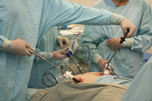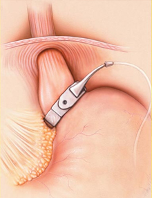 In this procedure a silicon band lined with an inflatable balloon is placed laparoscopically around the stomach near its upper end creating a small pouch (15 to 30 cc vol.) and a narrow passage leads into the larger remainder of stomach.